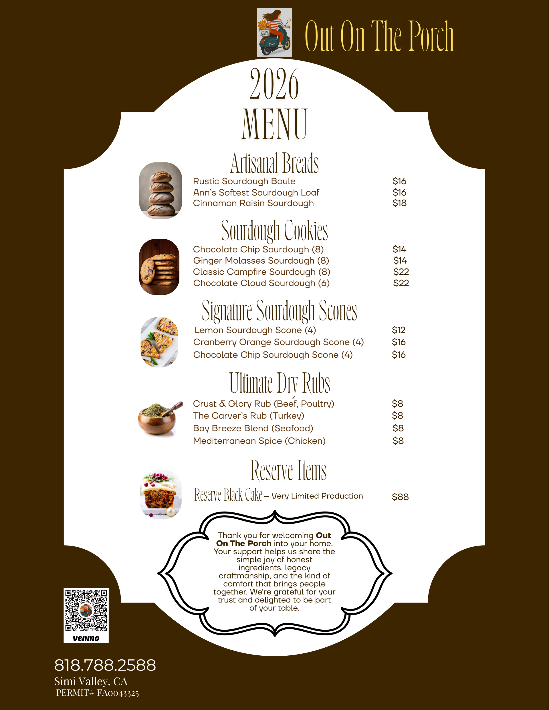 For foodies, gourmet enthusiasts, and health-conscious consumers alike, At Out On The Porch, our team is dedicated to bringing you products crafted with the highest quality ingredients, heritage techniques, and unwavering passion. Explore how our artisanal breads, legacy cookies, signature scones and curated dry rubs can elevate your everyday moments into an epicurean experience. Our passion is rooted in tradition; our products reflect the mastery of fermentation and patience. We honor the ancient rhythm of breadmaking, through a slow and methodical ritual of nurturing, handling, and temperature, allowing us to extract the outmost complexity and richness in every loaf and every jar.
